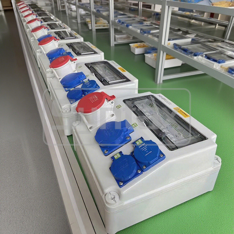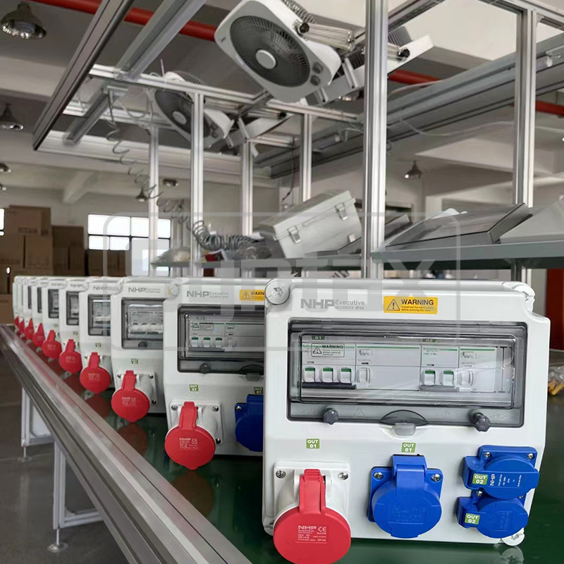 Το κουτί διανομής ισχύος 32 AMP είναι κατασκευασμένο από υλικό PC σε τοίχο,ΕπικεφαλήςΑν δεν υπάρχει εισερχόμενη πρίζα του κουτιού, μπορείτε απλά να συνδέσετε τα εισερχόμενα καλώδια στο τερματικό μέσα στο κουτί.Οι έξοδοι πρίζες της πρίζας 4P 32A 400v και της πρίζας 3P + E 25A 400v PC συνδέονται μεταξύ τους και προστατεύονται από ένα RCBO 3P 32A 30mAΕνώ η πρίζα 2P+E 16A 220V και η πρίζα 2P+E 13A 220v του Ηνωμένου Βασιλείου συνδέονται μεταξύ τους και προστατεύονται από ένα 2P 16A 30mA RCBO, όλα τα RCBOs κατασκευάζονται από την Schneider.Όλα τα πλαίσια διανομής ισχύος είναι κατασκευασμένα για παραγγελία.