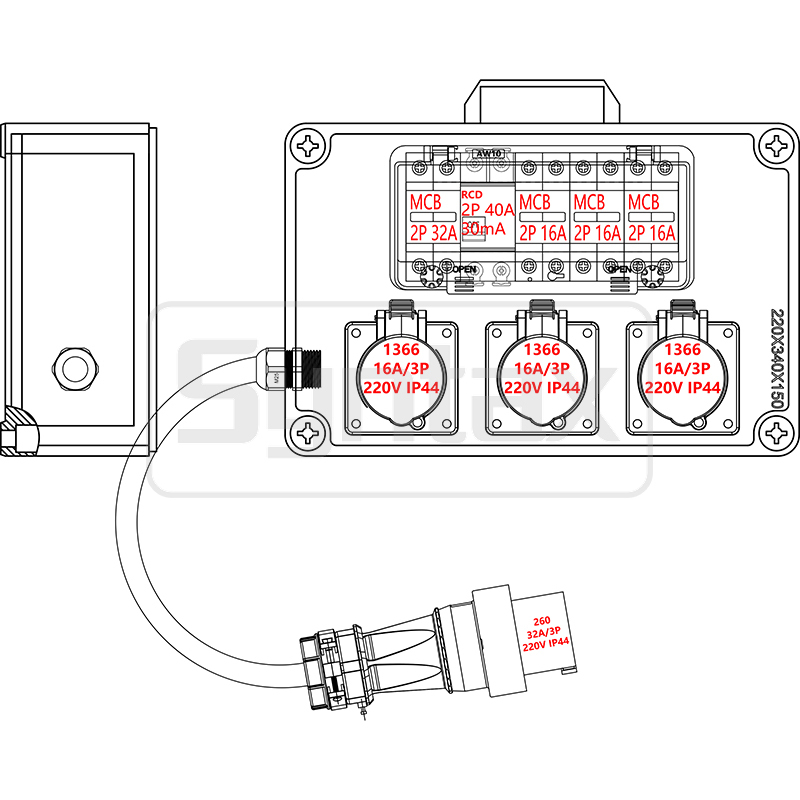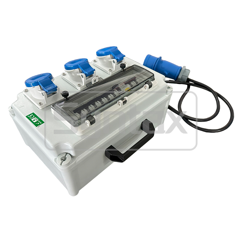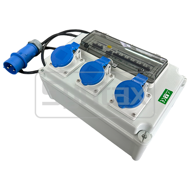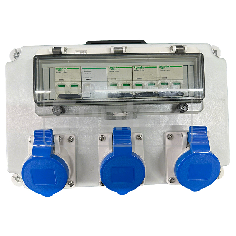 Η πλακέτα διανομής μονής φάσης 32 AMP για εξωτερική χρήση είναι κατασκευασμένη από υλικό PC, διαθέτει καλώδιο επέκτασης 3C4mm2 1,5m με πρίζα 3P 32A 220v, προστατευμένη από MCB + RCCB.Οι έξοδοι πρίζες είναι τοποθετημένες σε πίνακα ευθείας τύπου 3P 16A 220v IP44 πρίζεςΌλες οι πλακέτες διανομής ισχύος είναι κατασκευασμένες για παραγγελία.